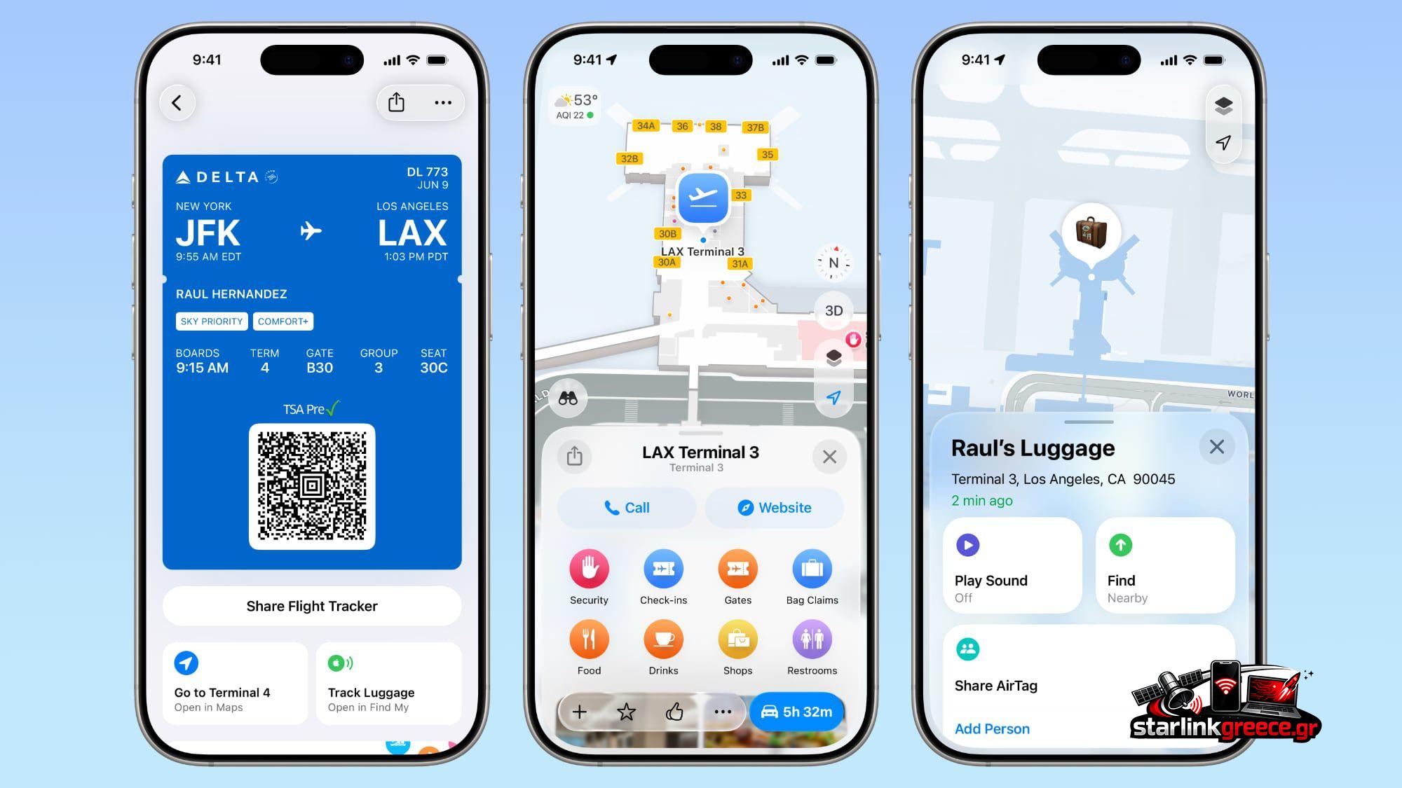 • Παρακολούθηση Αποσκευών: Οι επιβάτες μπορούν να παρακολουθούν τις αποσκευές τους μέσω της εφαρμογής Find My, εφόσον έχουν επισυνάψει ένα AirTag.