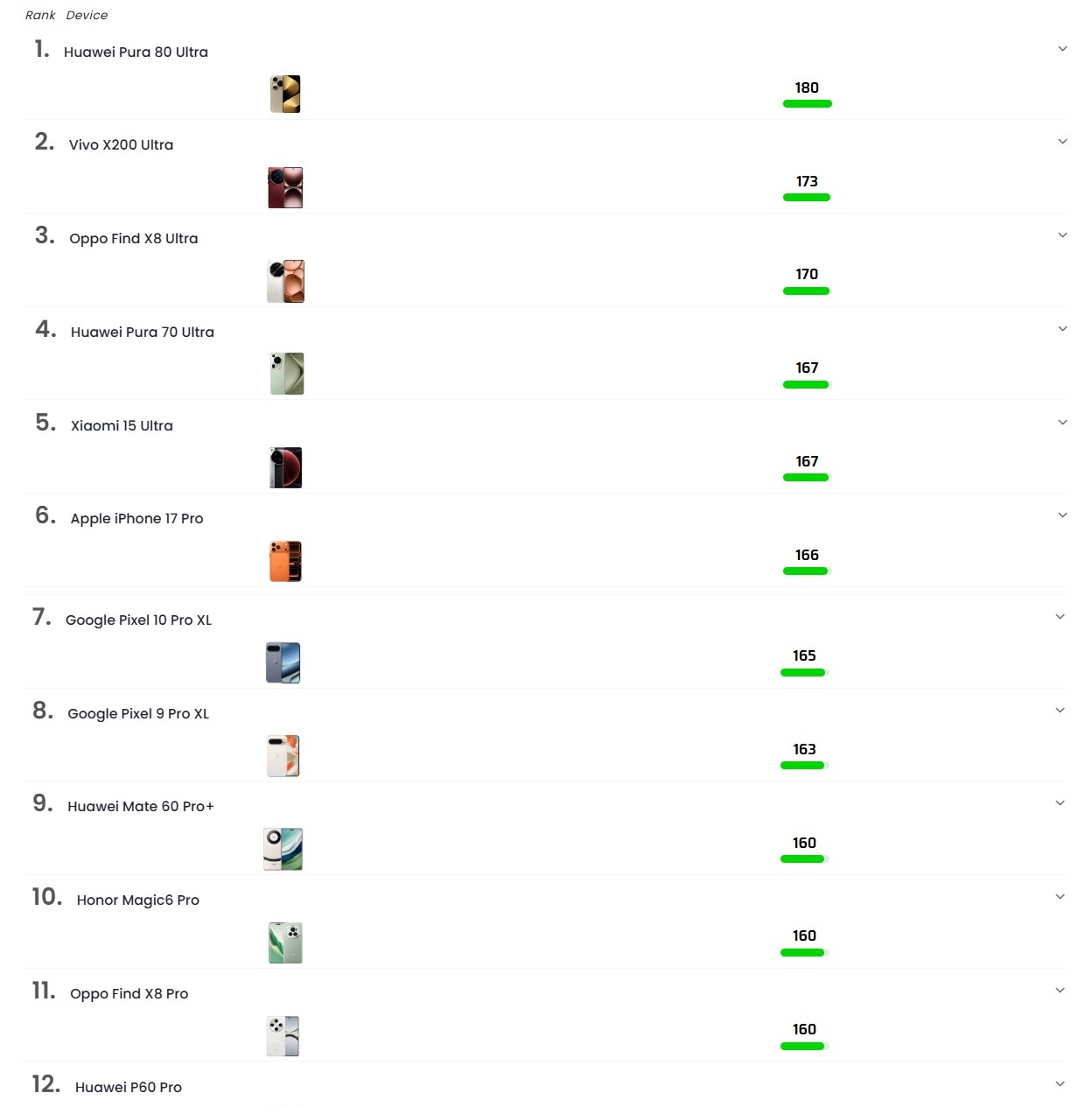 Η κορυφαία θέση στην κατηγορία καμερών καταλαμβάνεται από το Huawei Pura 80 Ultra, που όχι μόνο συνδυάζει τις λειτουργίες ενός κινητού με εκείνες μιας DSLR, αλλά εκτοξεύει και την εμπειρία φωτογραφίας στα ύψη. Ο πρωταγωνιστής αυτής της λίστας έχει κατακτήσει την κορυφή στη λήψη φωτογραφιών με εκπληκτική βαθμολογία 180 πόντων. Ακολουθούν το Vivo X200 Ultra με 173 πόντους και το Oppo Find X8 Ultra με 170 πόντους, αποδεικνύοντας την εξαιρετική ποιότητα που προσφέρουν οι φετινές κορυφαίες συσκευές.