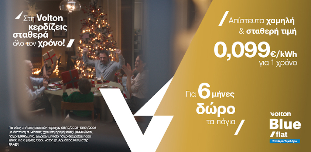 Η Volton, παραμένοντας πιστή στην αποστολή της να προσφέρει καινοτόμα προϊόντα και να μετατρέπει την ενέργεια σε πραγματική αξία, ανακοινώνει μία μοναδική Χριστουγεννιάτικη προσφορά: δωρεάν τα πάγια για 6 μήνες σε όσους επιλέξουν το σταθερό πρόγραμμα ρεύματος Volton Blue Flat.