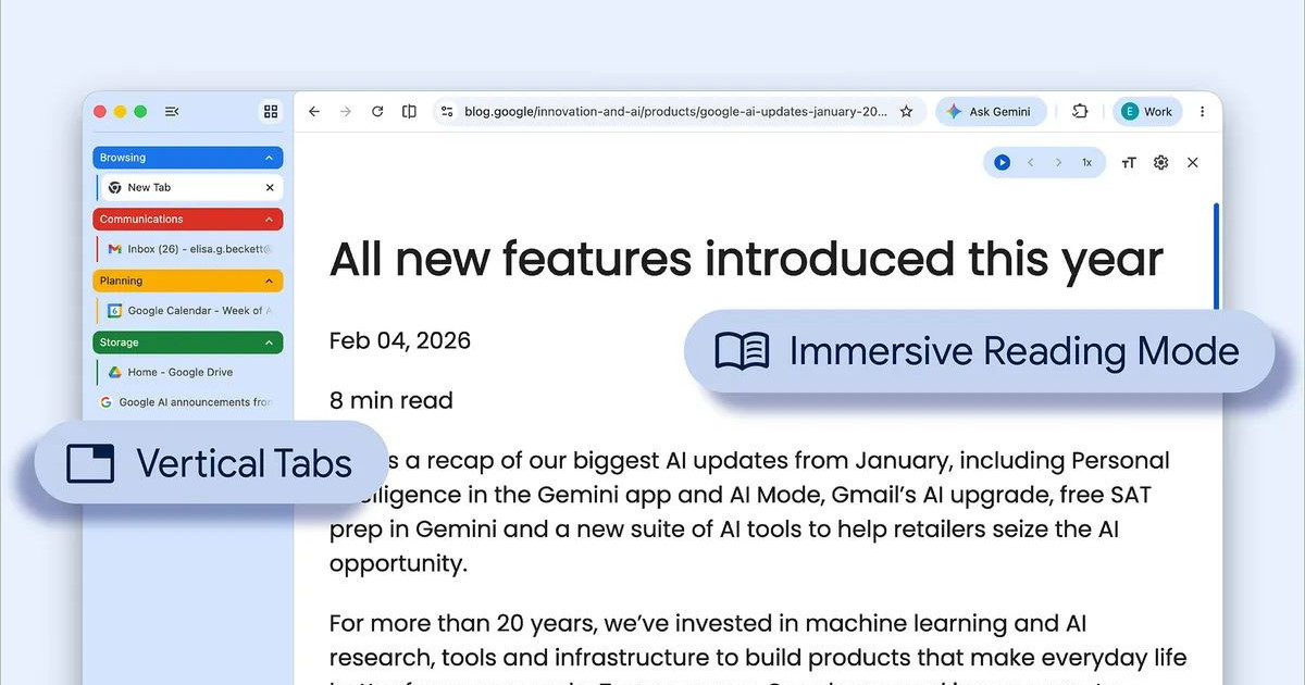 Η Google εισάγει επίσημα δύο νέα εργαλεία που υπόσχονται να βελτιώσουν την παραγωγικότητα στο Chrome: τις Κάθετες Καρτέλες (Vertical Tabs) και την Λειτουργία Εμβάθυνσης στην Ανάγνωση (Immersive Reading Mode). Αυτές οι λειτουργίες διευκολύνουν τη διαχείριση των ανοιχτών καρτελών και απομονώνουν το κείμενο από περιττούς οπτικούς περισπασμούς, προσφέροντας μία καλύτερη εμπειρία ανάγνωσης.