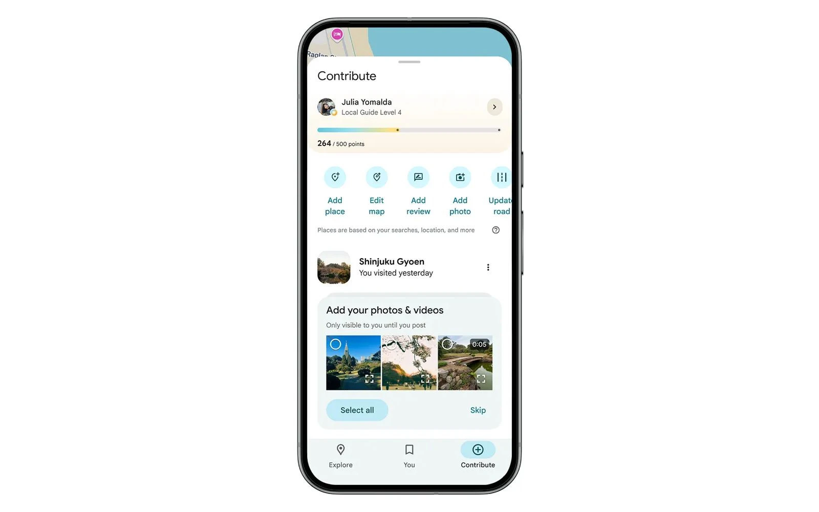 Το Google Maps αναβαθμίζει την καρτέλα Contribute με την προσθήκη τριών καινοτόμων λειτουργιών: αυτόματης πρότασης φωτογραφιών από τη συσκευή του χρήστη, δημιουργίας λεζαντών μέσω μοντέλων τεχνητής νοημοσύνης (Gemini) και ανανέωσης του συστήματος επιβράβευσης για τους Local Guides με χρυσά εμβλήματα. Αυτές οι λειτουργίες είναι ήδη διαθέσιμες σε Android και iOS, με τα εργαλεία AI να υποστηρίζουν αρχικά μόνο την αγγλική γλώσσα.