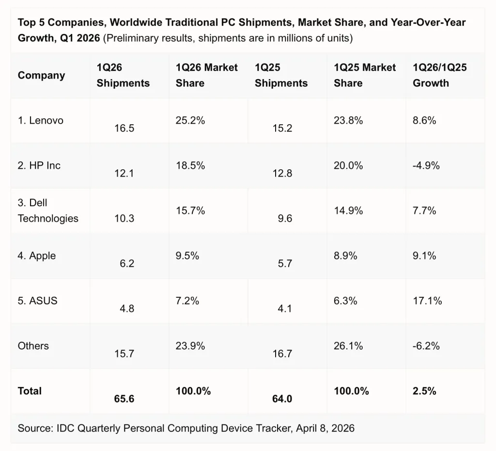 Η Lenovo οδηγεί τις πωλήσεις με 16,5 εκατομμύρια αποστολές και ανάπτυξη 8,6%. Ακολουθεί η HP με 12,1 εκατομμύρια αποστολές και πτώση 4,9%, ενώ η Dell καταγράφει 10,3 εκατομμύρια αποστολές και αύξηση 7,7%.