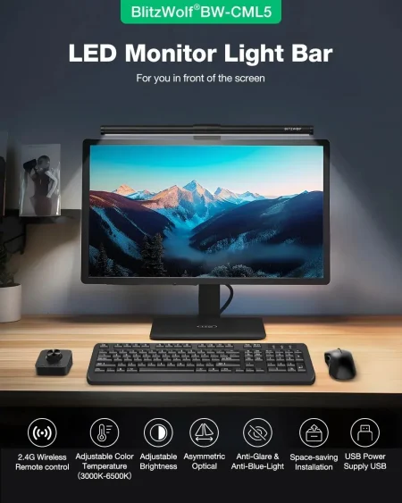Το BlitzWolf BW-CML5 είναι μια πρωτοποριακή μπάρα φωτισμού οθόνης, σχεδιασμένη να μειώνει την καταπόνηση των ματιών σας κατά τη διάρκεια παρατεταμένης χρήσης υπολογιστή. Με σύγχρονο ασύρματο τηλεχειριστήριο, ρυθμιζόμενη θερμοκρασία χρώματος από 2700K έως 6500K και αντιθαμβωτικό σχεδιασμό, η BW-CML5 εξασφαλίζει μια άνετη και χαλαρωτική εμπειρία θέασης που βελτιώνει την παραγωγικότητά σας.