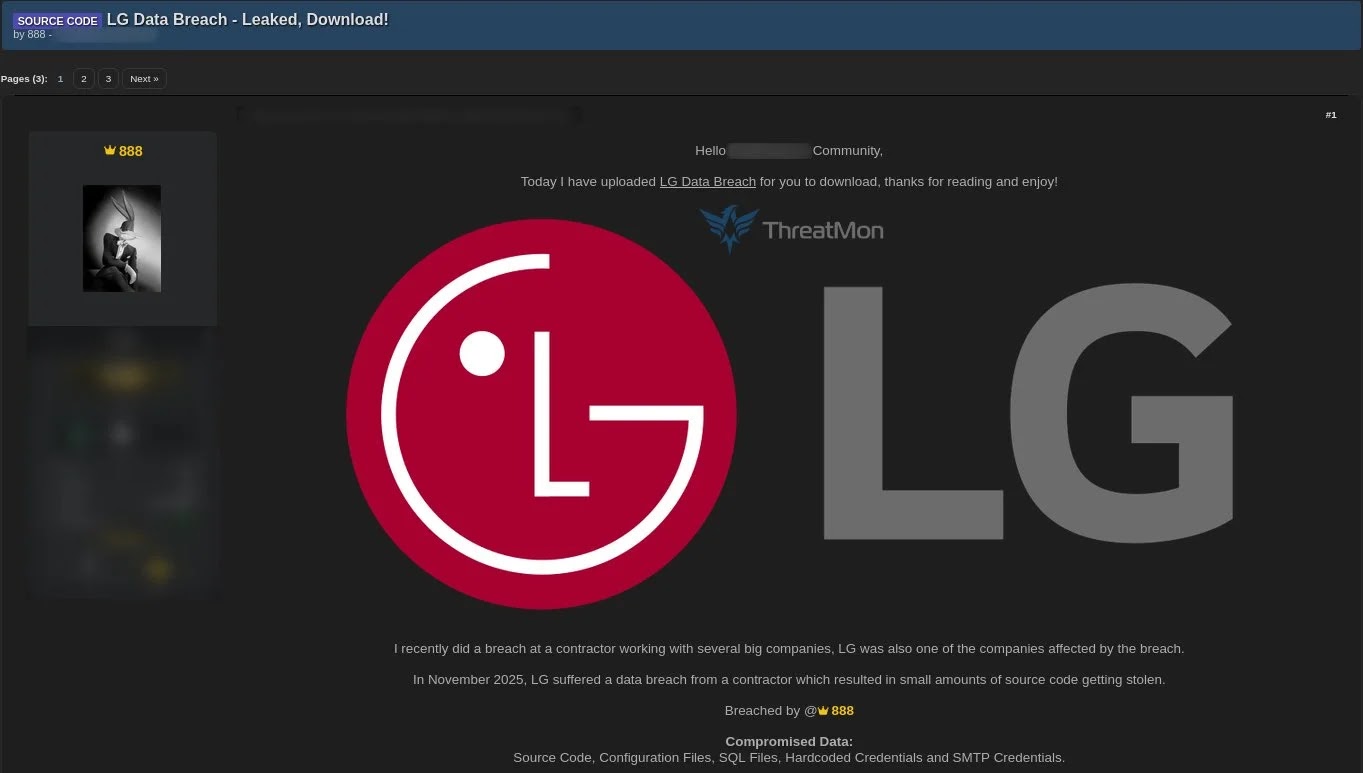 Η διαρροή εμφανίστηκε μέσω μιας ανάρτησης στο ThreatMon, μια πλατφόρμα που παρακολουθεί τη δραστηριότητα του σκοτεινού ιστού, όπου ο “888” μοιράστηκε δείγματα για να αποδείξει την αυθεντικότητα. Περιγράφεται ότι προέρχεται από ένα σημείο πρόσβασης εργολάβου, το σύνολο δεδομένων φέρεται να καλύπτει πολλά συστήματα LG, υπονοώντας μια ευπάθεια της εφοδιαστικής αλυσίδας και όχι μια άμεση εταιρική εισβολή.