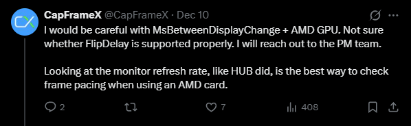 Εξαντλώ αργή κίνηση λήψη βίντεο με χιλιάδες καρέ ανά δευτερόλεπτο ή ενσωματωμένο μετρητή ρυθμού ανανέωσης στην οθόνη μου, δεν έχω συγκεκριμένο τρόπο να δοκιμάσω τον ρυθμό καρέ, επομένως είναι πιθανώς καλύτερο να πειραματιστείτε με κάθε μοντέλο για να βρείτε την καλύτερη επιλογή. Ωστόσο, με γυμνό μάτι, δεν φαίνεται ότι το FSR 4.0.0 FG έχει πρόσθετα προβλήματα ρυθμού πλαισίου σε σύγκριση με την εφαρμογή του FSR 3.1.6 – αν και κανένα δεν είναι εντελώς ομαλό, θα έλεγα ότι και τα δύο εμπίπτουν καλά στη σφαίρα του χρησιμοποιήσιμου. Δοκίμασα να χρησιμοποιήσω τη μέτρηση MsBetweenDisplayCapture του CapframeX για να δω εάν κάποια προβλήματα καθυστέρησης καρέ μπορούν να εντοπιστούν με το FSR 4.0.0 FG, αλλά αποδεικνύεται ότι αυτός δεν είναι στην πραγματικότητα ένας αξιόπιστος τρόπος δοκιμής του ρυθμού καρέ FG, όπως επισημαίνει ο ίδιος ο δημιουργός του λογισμικού.