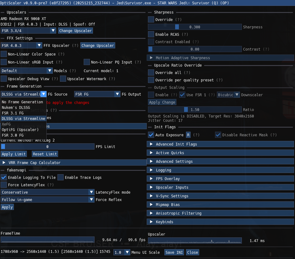 Εάν το παιχνίδι σας έχει DLSS FG που έχει υλοποιηθεί μέσω Streamline SDK 2+ (αλλά όχι υποστήριξη FSR FG), η καλύτερη επιλογή σας είναι να χρησιμοποιήσετε τις εισόδους DLSS του παιχνιδιού για να δημιουργήσετε μια έξοδο FSR 4.0.0 FG. Θα χρησιμοποιήσουμε το Star Wars: Jedi Survivor ως παράδειγμα για αυτό.