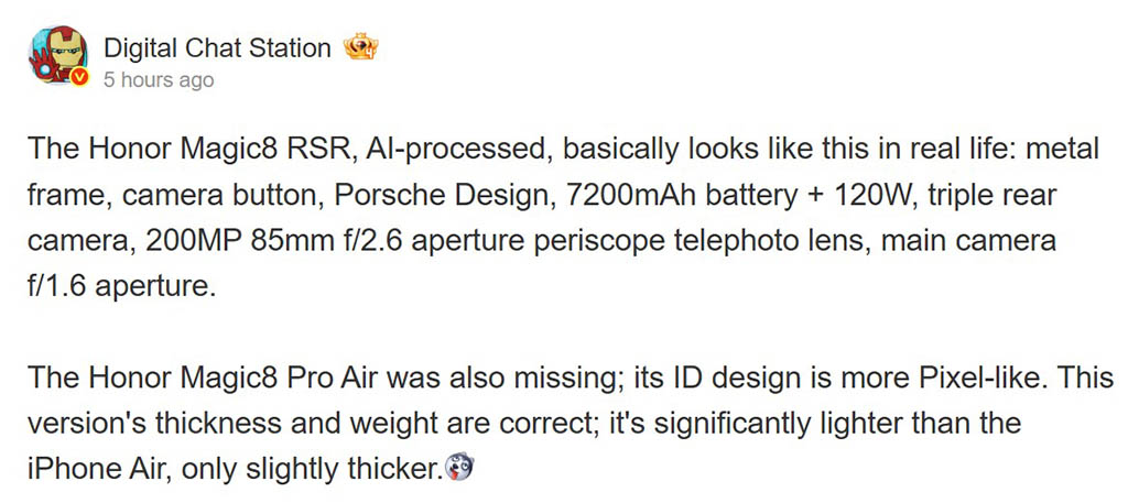 Εκτός από τη νέα συσκευή Airy, το Honor Magic 8 RSR άρχισε επίσης να συγκεντρώνει την προσοχή στην αγορά, ειδικά για τις προδιαγραφές της κάμερας. Και η τελευταία διαρροή ρίχνει ένα ξεκάθαρο φως σε αυτό το θέμα αποκαλύπτοντας τις κύριες παραμέτρους της επόμενης γενιάς συσκευής RSR.