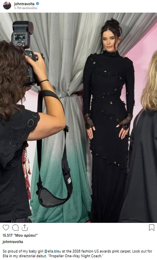 «Είμαι τόσο περήφανος για το κορίτσι μου @ella.bleu στο ροζ χαλί των Βραβείων Μόδας 2026. Να περιμένετε την Ella στο σκηνοθετικό μου ντεμπούτο, “Propeller One-Way Night Coach”».