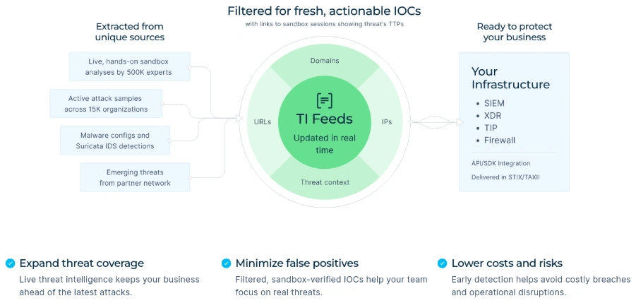 Με την υποστήριξη δεδομένων από πάνω από 15.000 SOC και ερευνητές που χρησιμοποιούν το διαδραστικό sandbox κακόβουλου λογισμικού του ANY.RUN, οι ροές παρέχουν ζωντανή νοημοσύνη για πραγματικές επιθέσεις που συμβαίνουν αυτήν τη στιγμή. Κάθε εγγραφή υποστηρίζεται από ανάλυση συμπεριφοράς και στοιχεία από τον πραγματικό κόσμο.