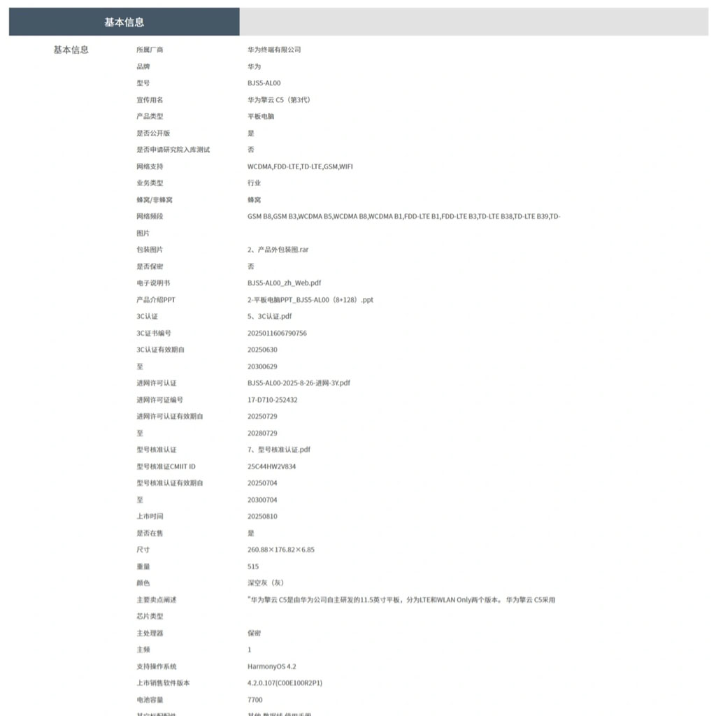 Το tablet θα κάνει το ντεμπούτο του σε δύο παραλλαγές: LTE και WLAN. Η λίστα αποκαλύπτει μια πίσω κάμερα 13MP και μια μπαταρία 7700mAh για το tablet Qingyun C5. Άλλα χαρακτηριστικά περιλαμβάνουν μια διεπαφή USB Type-C και μια προεγκατεστημένη έκδοση HarmonyOS 4.2.0.107.