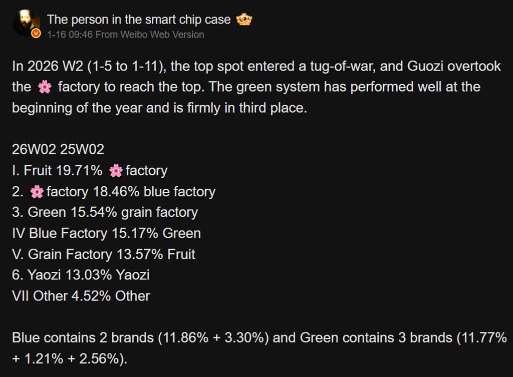Το Smart Chip Insider στο Weibo αποκάλυψε τους κορυφαίους κατασκευαστές τηλεφώνων στην Κίνα και τις επιδόσεις τους τις δύο πρώτες εβδομάδες του 2026. Η Apple βρίσκεται στην πρώτη θέση ενώ η Huawei εμφανίστηκε στη δεύτερη θέση με μια μικρή διαφορά μεριδίου αγοράς.
