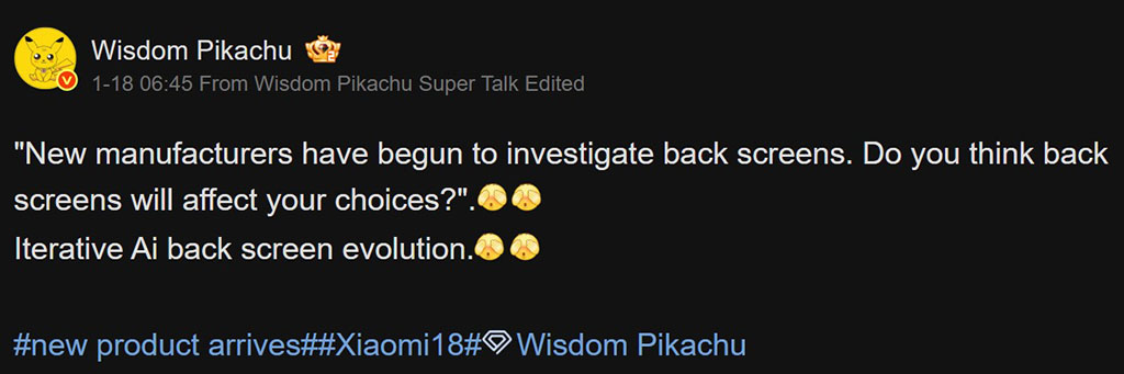 Ο tipster σημείωσε ότι τα επερχόμενα μοντέλα Xiaomi 18 Pro θα υιοθετήσουν πραγματικές οθόνες με τεχνητή νοημοσύνη. Ίσως οι χρήστες να έχουν πιο ενδιαφέρουσες λειτουργίες στην πίσω οθόνη.