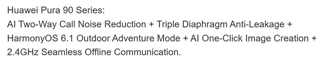 Η Huawei ενδέχεται να εισαγάγει μια λειτουργία «τριπλού διαφράγματος κατά της διαρροής» για τηλέφωνα Pura 90 που θα βελτιώσει το απόρρητο του ήχου κατά τη διάρκεια των κλήσεων. Θα μπορούσε να χρησιμοποιήσει ένα πρόγραμμα οδήγησης μείωσης διαρροών για το σετ διπλών ηχείων του τηλεφώνου, αποτρέποντας τη διαρροή ήχου από τις κλήσεις και διασφαλίζοντας ότι οι άνθρωποι που βρίσκονται κοντά δεν μπορούν να τον ακούσουν.