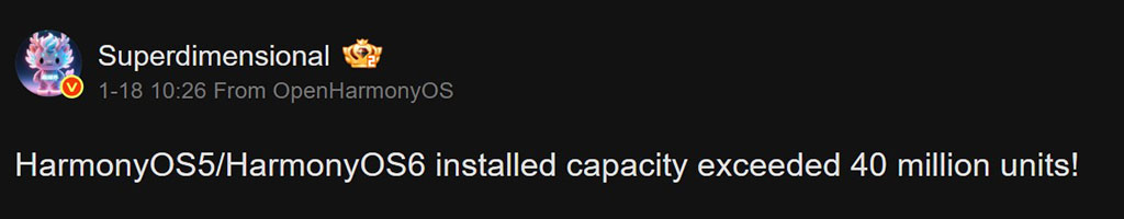 Τώρα, ο tipster του Weibo SuperDimensional αποκάλυψε ότι οι μονάδες εγκατάστασης HarmonyOS 5 και 6 έχουν φτάσει τα 40 εκατομμύρια. Είναι περίπου 150.000 μονάδες εγκαθίστανται καθημερινά.