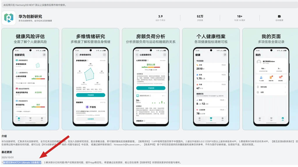 Η εταιρεία ενημέρωσε πρόσφατα την εφαρμογή «Huawei Innovation Research» στην έκδοση 1.1.10.300. Είναι κυρίως υπεύθυνο για την τήρηση προσωπικών αρχείων υγείας, ανάλυση επιβάρυνσης κολπικής μαρμαρυγής, πολυδιάστατη συναισθηματική έρευνα και πολλά άλλα.