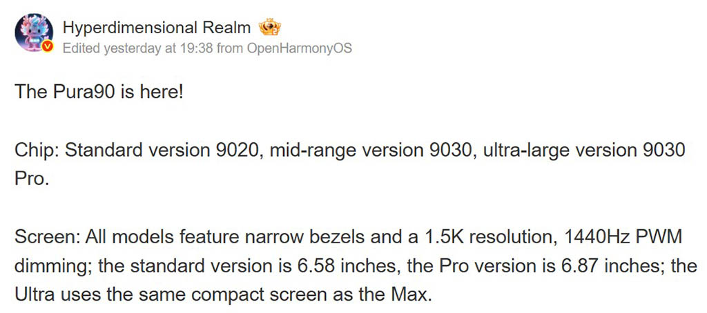 Η SuperDimensional σημείωσε ότι η έκδοση βανίλιας Pura 90 θα διαθέτει το chipset Kirin 9020, ακριβώς όπως το Mate 80 τηλέφωνο. Ενώ τα μοντέλα Pro (Pura 90 Pro και Pro+) θα κάνουν το ντεμπούτο τους με το τυπικό τσιπ Kirin 9030 5G.