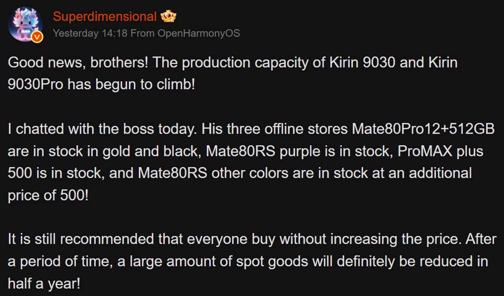 Τα πράγματα άρχισαν να βελτιώνονται από αυτόν τον μήνα και τα μοντέλα Mate 80 Pro Max και RS θα είναι σύντομα ξανά στην αγορά. Ας περιμένουμε λίγες μέρες ακόμα για να ακούσουμε επίσημη ανακοίνωση για αυτό το θέμα.