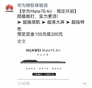 Σύμφωνα με πληροφορίες, τα καταστήματα της Huawei ξεκίνησαν τις κρατήσεις του Mate 70 Air