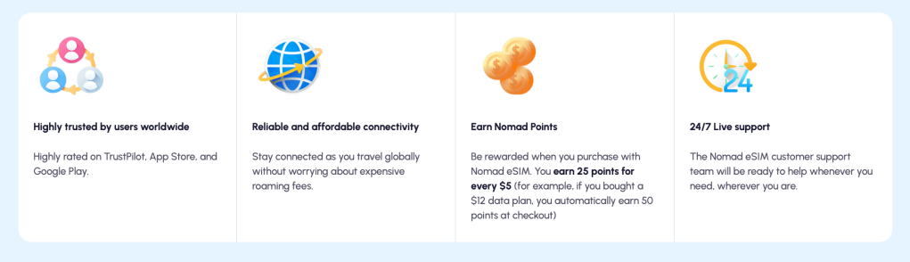 Με περισσότερες από 20.000 κριτικές στο Trustpilot και βαθμολογία 4,8 αστέρων στο App Store, το Nomad έχει δημιουργήσει μια φήμη εμπιστοσύνης στους ταξιδιώτες. Υπάρχει μεγάλη υποστήριξη πελατών διαθέσιμη μέσω της εφαρμογής και οι χρήστες επαινούν συνεχώς πώς η ομάδα υποστήριξης βοηθά στην επίλυση προβλημάτων.