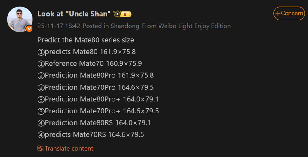 Ο UncleKanshan μοιράστηκε μια λίστα με τις διαστάσεις των ακουστικών Mate 2025. Είναι μια περιγραφή του πόσο τα τηλέφωνα Huawei Mate 80 είναι μεγαλύτερα, φαρδύτερα ή πιο λεπτά από τα μοντέλα Mate 70.