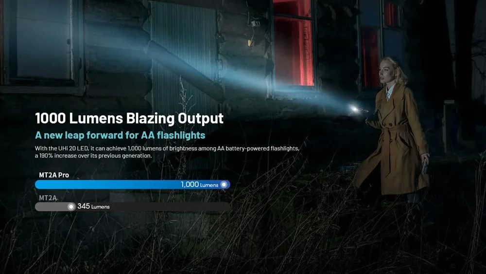 - Φωτεινότητα έως και 1000 lumens: Ο NITECORE MT2A Pro διαθέτει ισχυρό LED φακό, που παρέχει φωτεινότητα έως και 1000 lumens. Αυτό είναι αρκετό φως για να φωτίσει ένα σκοτεινό δωμάτιο ή να φωτίσει ένα μακρινό αντικείμενο.
