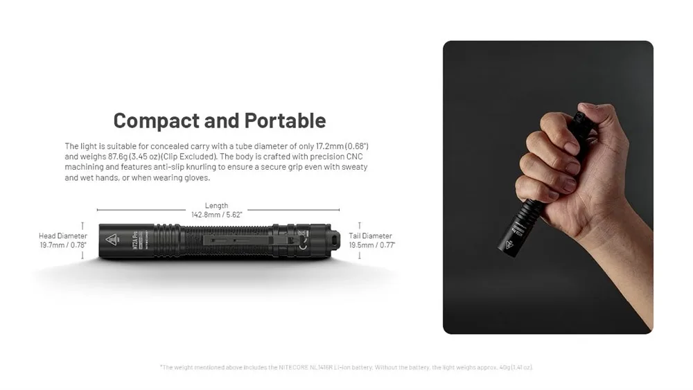 - Διατίθεται με επαναφορτιζόμενη μπαταρία NL1416R: Ο NITECORE MT2A Pro διατίθεται με επαναφορτιζόμενη μπαταρία NL1416R. Αυτή η μπαταρία προσφέρει έως και 20 ώρες λειτουργίας με μέγιστη φωτεινότητα.