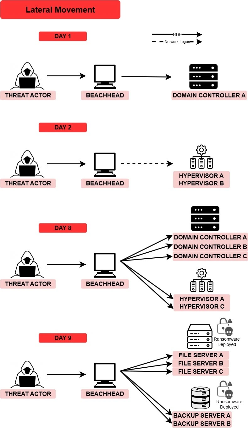 Η αλυσίδα επιθέσεων αποκαλύπτει μια μεθοδική προσέγγιση όπου οι φορείς απειλών αποκτούν αρχική πρόσβαση μέσω διαπιστευτηρίων πρωτοκόλλου απομακρυσμένης επιφάνειας εργασίας, που πιθανότατα προέρχονται από κακόβουλο λογισμικό πληροφορικής, παραβιάσεις δεδομένων ή μεσίτες αρχικής πρόσβασης.