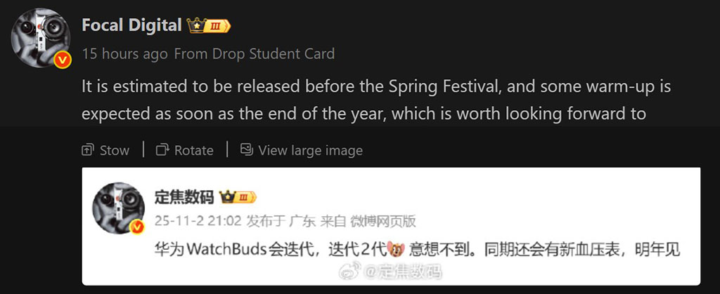 Ο tipster του Weibo @FixedFocus σημείωσε ότι η συσκευή Watch Buds 2 είναι στα σκαριά και μπορεί να κάνει το ντεμπούτο της μέχρι το τέλος αυτού του έτους. Μπορεί επίσης να συμβεί η Huawei να ξεκινήσει την προώθηση του νέου smartwatch πριν από την κυκλοφορία το 2025 και να το κυκλοφορήσει το 1ο τρίμηνο του 2026.