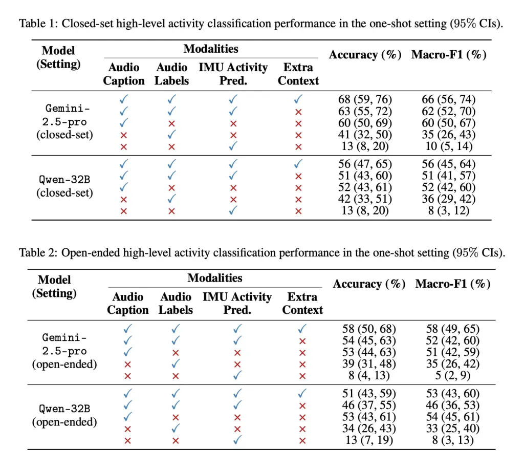 Οι ερευνητές έτρεξαν τα δεδομένα ήχου και κίνησης μέσω μικρότερων μοντέλων που παρήγαγαν λεζάντες κειμένου και προβλέψεις τάξης και στη συνέχεια τροφοδοτούσαν αυτές τις εξόδους σε διαφορετικά LLM (Gemini-2.5-pro και Qwen-32B) για να δουν πόσο καλά μπορούσαν να αναγνωρίσουν τη δραστηριότητα.
