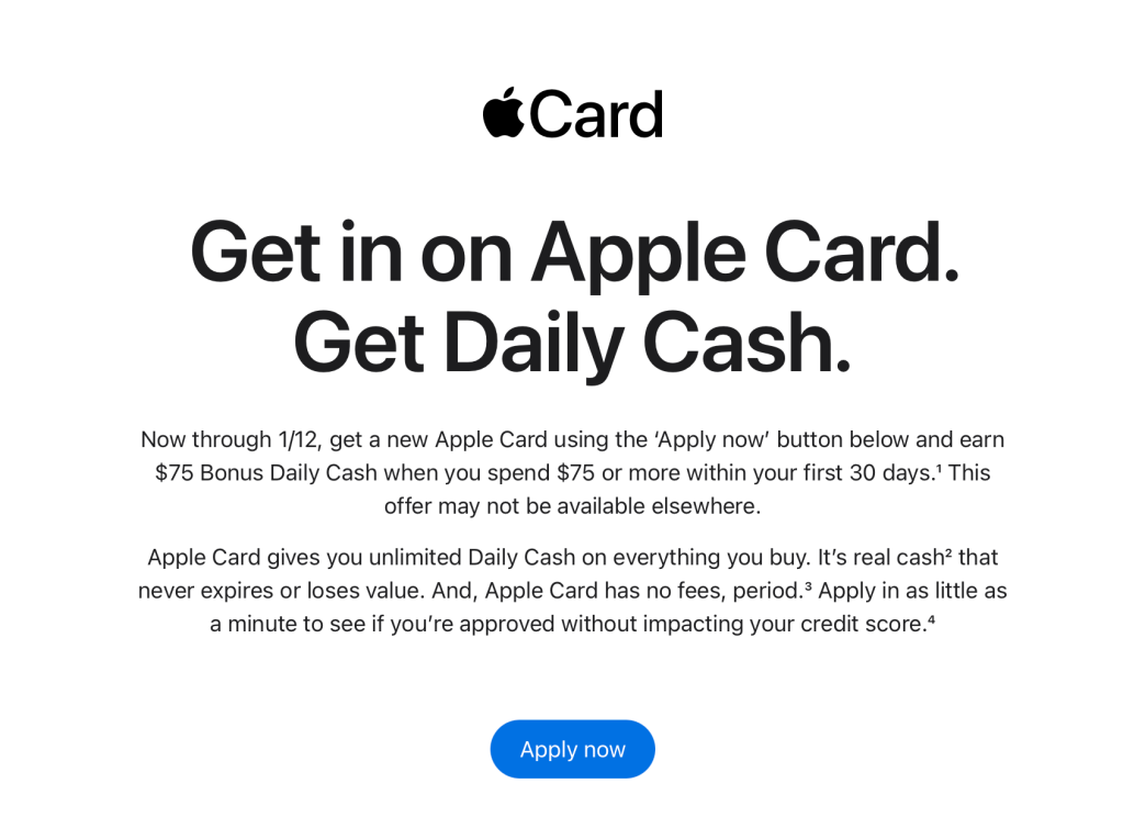 Έως τις 12 Ιανουαρίου, η Apple προσφέρει ένα ειδικό μπόνους εγγραφής κάρτας Apple, όπου μπορείτε κερδίστε $75 σε μπόνους καθημερινά μετρητά αφού ξοδέψατε 75 $ τις πρώτες 30 ημέρες. Εν ολίγοις, μπορείτε να το δείτε ως τα πρώτα σας 75 $ δωρεάν.