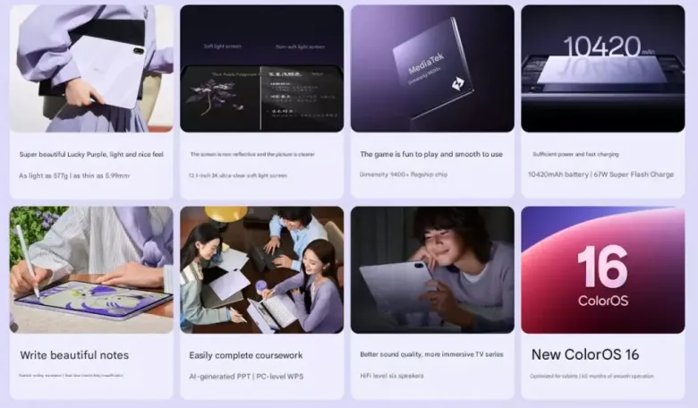 Υπάρχει επίσης η έκδοση soft light με ματ οθόνη απαλού φωτός που προστατεύει τα μάτια σαν χαρτί και διαχέει τη λάμψη. Το tablet τροφοδοτείται από MediaTek Dimensity 9400+ SoCμια σημαντική αναβάθμιση σε σχέση με τον προκάτοχό του, το Dimensity 8350, διαθέτει έως και 16 GB μνήμης RAM και κομψό μεταλλικό σχεδιασμό 5,99 mm. Το tablet έχει μπαταρία 10165mAh και υποστηρίζει γρήγορη φόρτιση 67W.