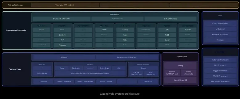 Το OpenVela υποστηρίζει διαφορετικές αρχιτεκτονικές όπως ARM32, ARM64, RISC-V, Xtensa, MIPS και CEVA, σύμφωνα με τις τεχνικές λεπτομέρειες της Xiaomi. Η μητρική γλώσσα προγραμματισμού που χρησιμοποιείται είναι κυρίως η C/C++ και οι εφαρμογές μπορούν να αναπτυχθούν σε JavaScript, το οποίο παρέχει ευελιξία και περιβάλλον φιλικό προς τους προγραμματιστές.
