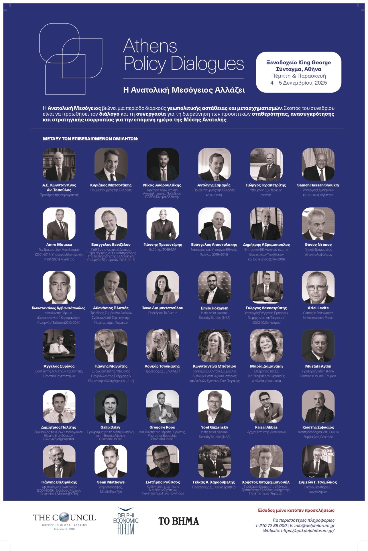 Η εφημερίδα ΤΟ ΒΗΜΑ, το Συμβούλιο Διεθνών Σχέσεων και το Οικονομικό Φόρουμ των Δελφών συνδιοργανώνουν στις 4 και 5 Δεκεμβρίου 2025, στο ξενοδοχείο King George στο Σύνταγμα, το Συνέδριο «Αθήνα: Διάλογοι για την Πολιτική», με ειδικό τίτλο «Η Ανατολική Μεσόγειος Αλλάζει».