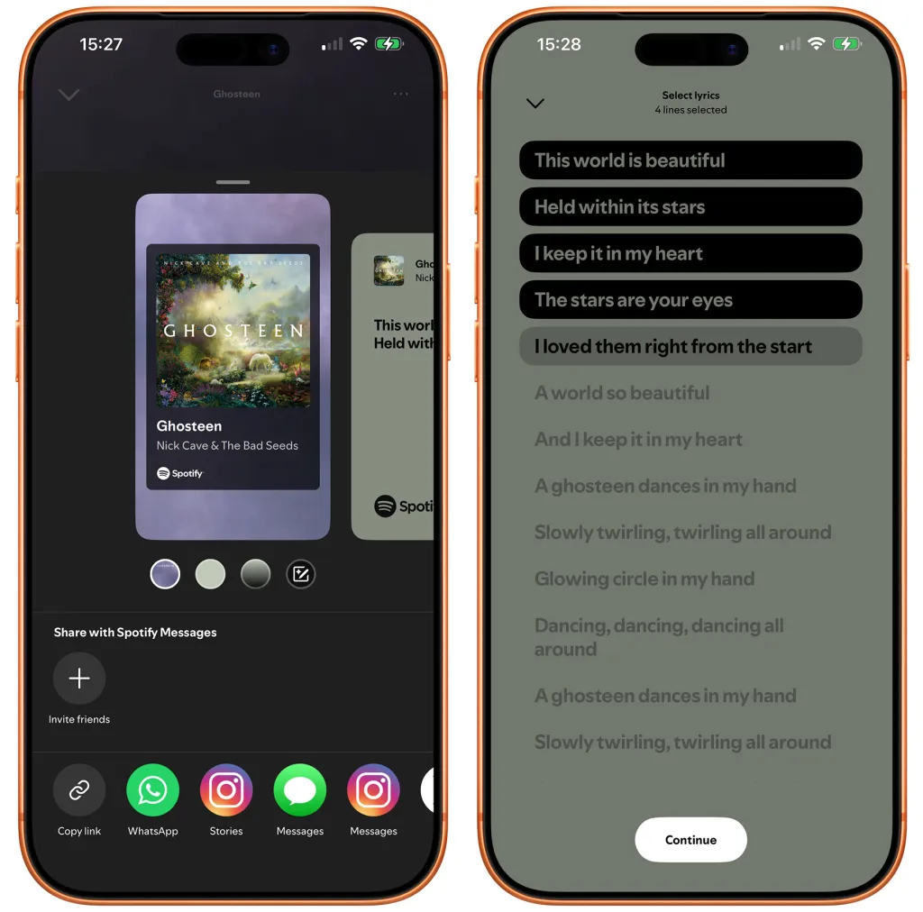 Εναλλακτικά, οι χρήστες μπορούν να μοιράζονται τα τραγούδια και τα podcast που ακούν απευθείας από το Spotify, με μερικές προσαρμοσμένες διατάξεις για να διαλέξουν, συμπεριλαμβανομένων συγκεκριμένων τμημάτων στίχων.