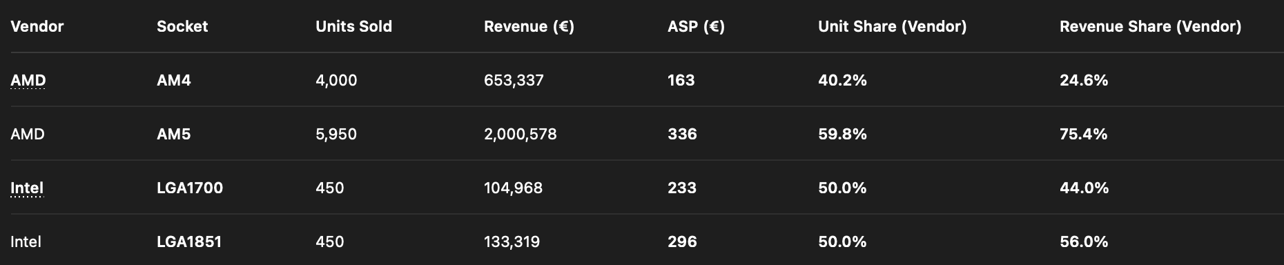 Η χρήση της πλατφόρμας AM4 για την κατασκευή υπολογιστών παιχνιδιών από τώρα είναι ακόμα πολύ φθηνότερη, αλλά δεν διαθέτει ανταγωνιστικές CPU για την παροχή υψηλών ρυθμών καρέ. Κρίμα που η AMD διέκοψε ήδη τα τσιπ Ryzen 5000X3D. Εάν η AMD επαναφέρει τους Ryzen 5800X3D και 5700X3D, αυτές οι CPU θα ξεπεράσουν εύκολα κάθε επεξεργαστή σε χρόνο μηδέν. Αυτή τη στιγμή, οι επεξεργαστές συμβατοί με AM4 αποτελούν σχεδόν 40% από τις συνολικές πωλήσεις CPU της AMD στο Amazon DE, κάτι που είναι αρκετά εντυπωσιακό, δεδομένου ότι η αγορά έχει ήδη μεταβεί στην AM5 πολύ νωρίτερα από την τρέχουσα περίοδο.
