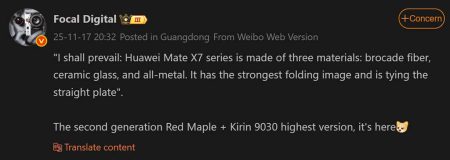 Ο tipster αποκαλύπτει ότι το πτυσσόμενο Huawei Mate X7 αποτελείται από τρία βασικά υλικά: ίνες μπροκάρ, κεραμικό γυαλί και εξ ολοκλήρου μέταλλο. Σύμφωνα με την επίσημη γραμμή ετικέτας: