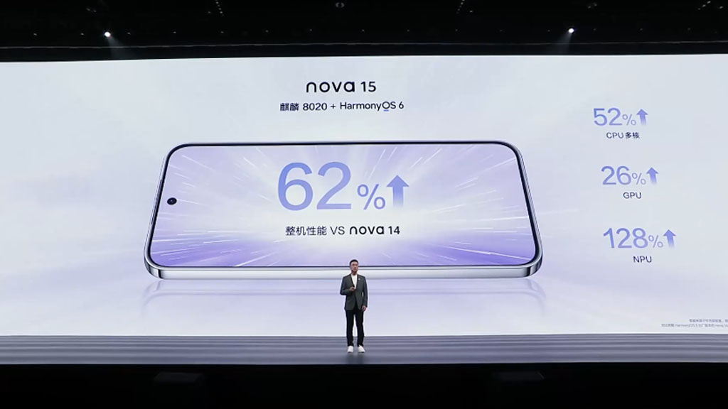 Βελτιώνει την απόδοση πολλαπλών πυρήνων της CPU κατά 52% για το Nova 15 σε σχέση με το smartphone προηγούμενης γενιάς. Εν τω μεταξύ, η απόδοση της GPU έχει φτάσει στο 26%, και η απόδοση λειτουργίας NPU έχει ενισχυθεί κατά 128% σε σύγκριση με τον προκάτοχο.