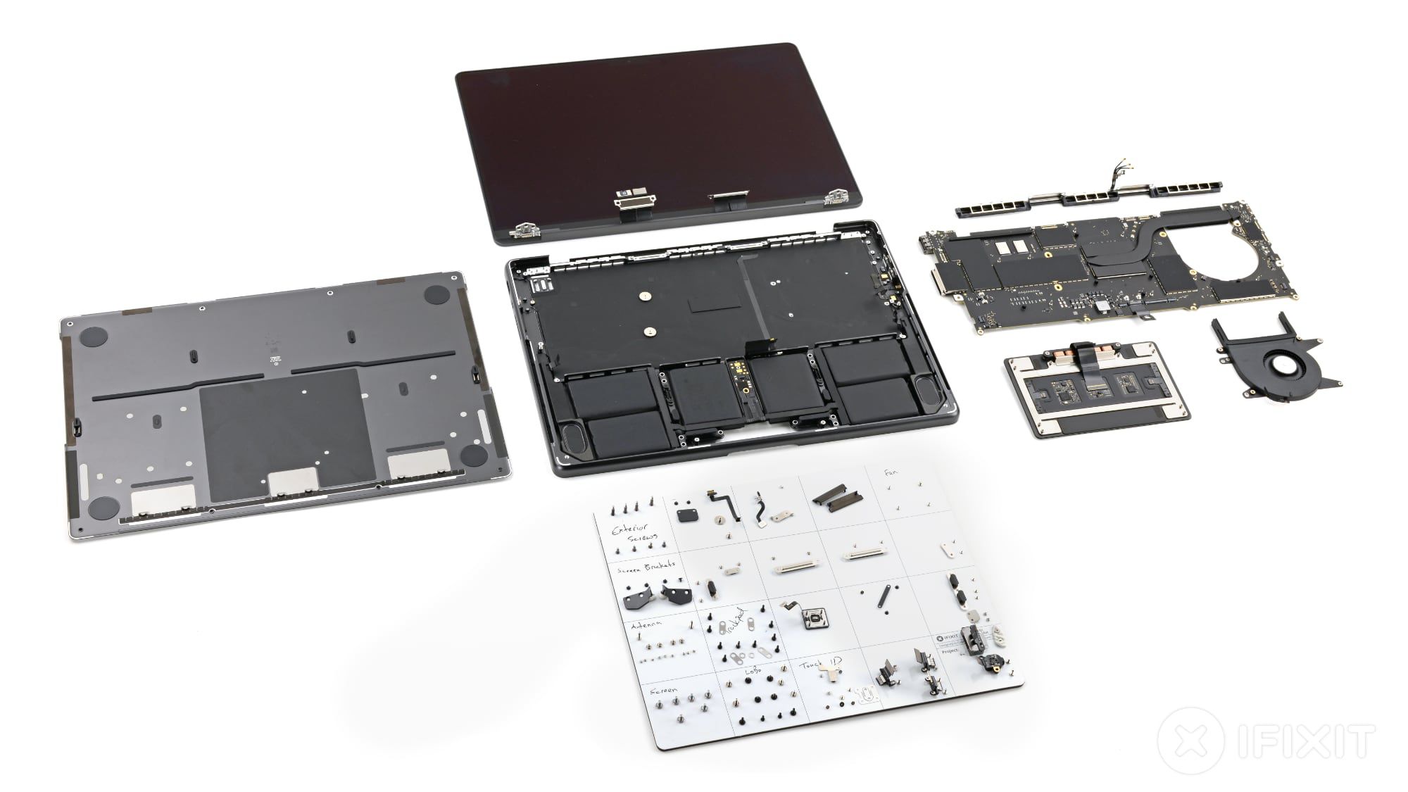 Το περίβλημα του MacBook Pro εξακολουθεί να είναι ασφαλισμένο με βίδες P5 και η αντικατάσταση της μπαταρίας είναι πιο δύσκολη από ό,τι χρειάζεται, επειδή η Apple πουλάει μόνο την μπαταρία ως μέρος του κύριου πλαισίου που περιλαμβάνει επίσης το πληκτρολόγιο. Η πρόσβαση στον ανεμιστήρα, τις θύρες και άλλα εξαρτήματα μέσα στο MacBook Pro απαιτεί την αφαίρεση της λογικής πλακέτας και το iFixit λέει ότι ουσιαστικά κάθε στοιχείο στο MacBook Pro πρέπει να βγαίνει για να πραγματοποιήσει αντικατάσταση μπαταρίας ακολουθώντας τα επίσημα βήματα επισκευής της Apple.