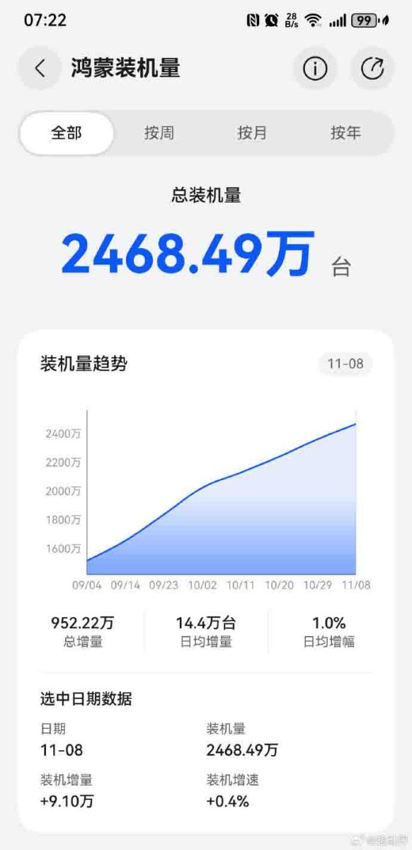 Τα τελευταία δεδομένα για αυτό το ιδιόκτητο λογισμικό αποκαλύπτουν ότι οι εγγενείς χρήστες του HarmonyOS έχουν ανέλθει σε σχεδόν 25 εκατομμύρια χρήστες. Συγκεκριμένα, ο συνολικός αριθμός των εγκαταστάσεων έχει αυξηθεί σε 24,6850 εκατομμύρια. Το λειτουργικό σύστημα βλέπει 144.000 εγκαταστάσεις κατά μέσο όρο την ημέρα, που είναι 1% αύξηση στην ημερήσια ανάπτυξη. Ωστόσο, ορισμένοι εμπιστευόμενοι πιστεύουν ότι ο πραγματικός αριθμός ημερήσιων εγκαταστάσεων μπορεί να είναι 100 χιλιάδες.