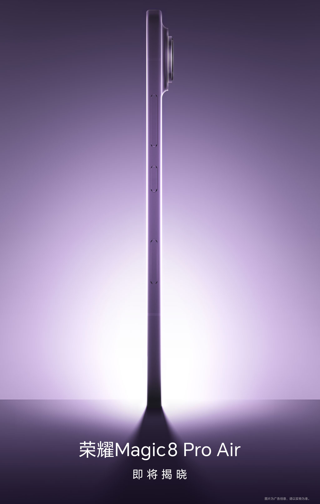 Κοιτάζοντας την εικόνα, το teaser τονίζει την άκρη του Magic 8 Pro Air, προβάλλοντας την εξαιρετικά λεπτή σχεδίασή του. Εμφανίζεται σε έντονη μωβ απόχρωση, εμποδίζοντας τους δρόμους φωτός.