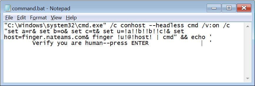 Αυτή η επίθεση κάνει κατάχρηση του πρωτοκόλλου Finger ως απομακρυσμένης μεθόδου παράδοσης σεναρίου, εκτελώντας finger [email protected][.]org και διοχετεύει την έξοδο του μέσω του επεξεργαστή εντολών των Windows, cmd.exe.